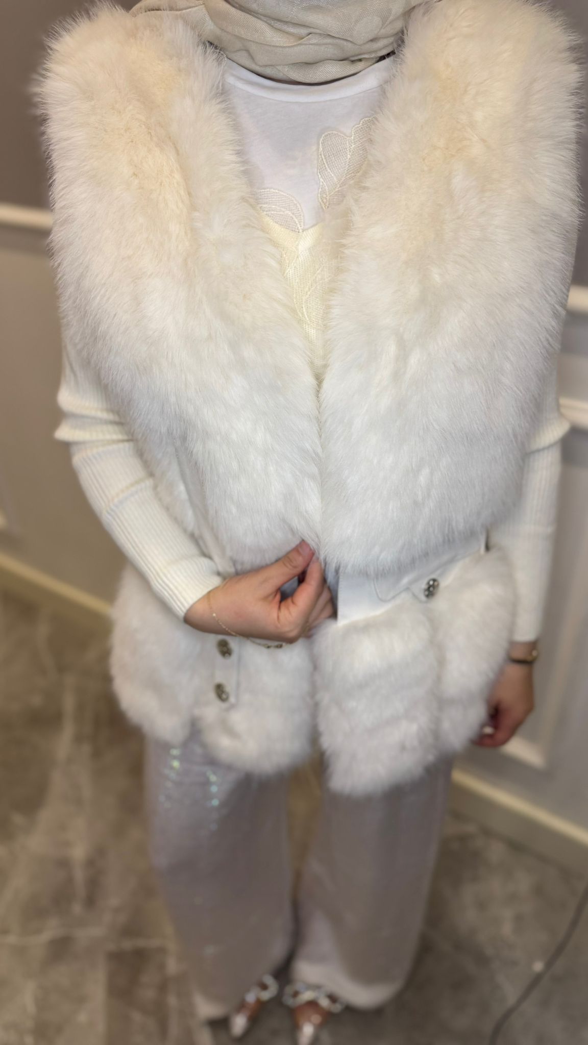Beyaz Deri Detaylı Kürk Yelek (36-40) Standart Beden