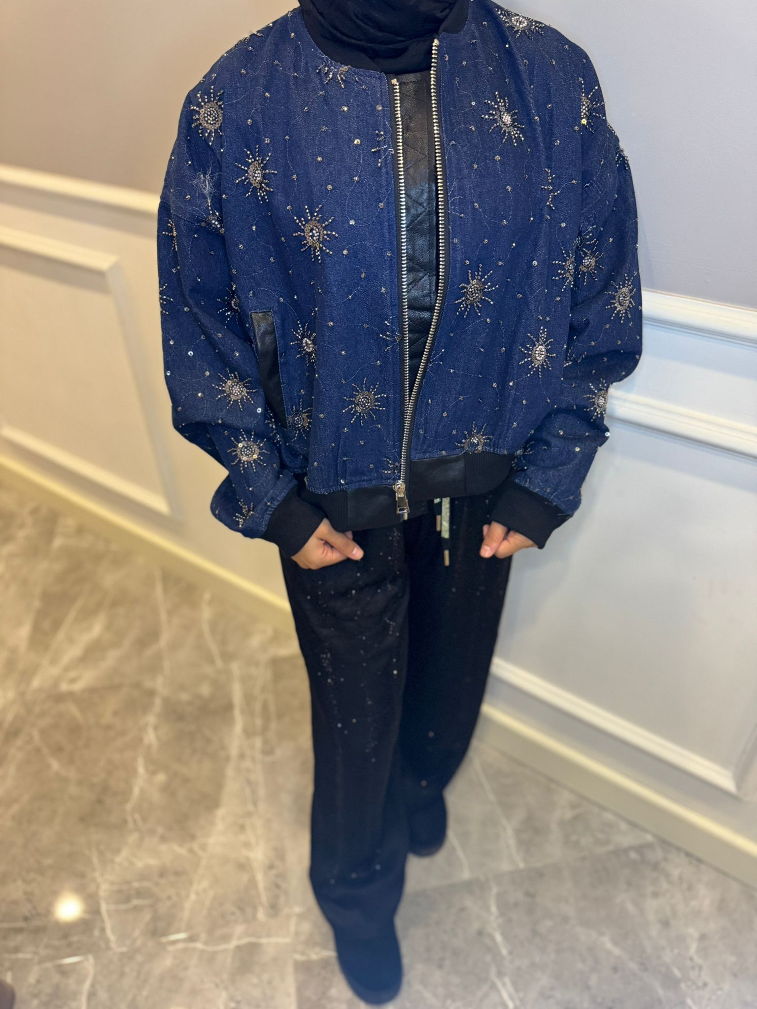 Mialatelier’in özel koleksiyonundan Taş İşlemeli Denim Bomber Ceket, spor tarzı şıklıkla buluşturan özgün bir parça. Denim kumaşın zamansız havası, özenle yerleştirilmiş altın tonlu taş işlemelerle bambaşka bir boyut kazanıyor. Günlük kombinlerde rahatlıkla tercih edilebilecek bu ceket, aynı zamanda ışıl ışıl detaylarıyla iddialı bir stil yaratıyor.